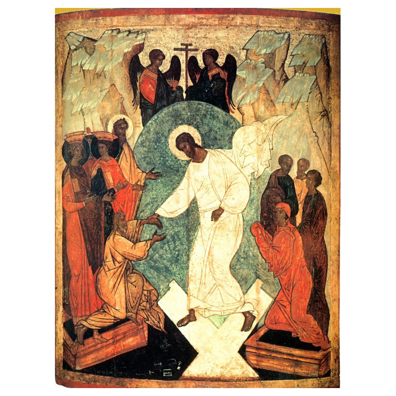 Kdo má blízko k výtvarnému sdělení, může meditovat přiloženou ikonu Sestoupení do pekel. Na křesťanském Východě tato událost totiž není vnímána jako výraz Kristova ponížení, ale jako vyjádření smyslu Vzkříšení. Kristus v zářivém rouchu vniká jako Vítěz do temnoty pekla a podsvětí. Zvedá za ruku Adama, Eva se mu klaní se zahalenýma rukama, v pozadí stojí další postavy Starého zákona, očekávající svého Spasitele. Skalnatá půda je rozevřena a dává nahlédnout do hluboké temnoty. Kristus však v zářivém rouchu stojí nad ní.