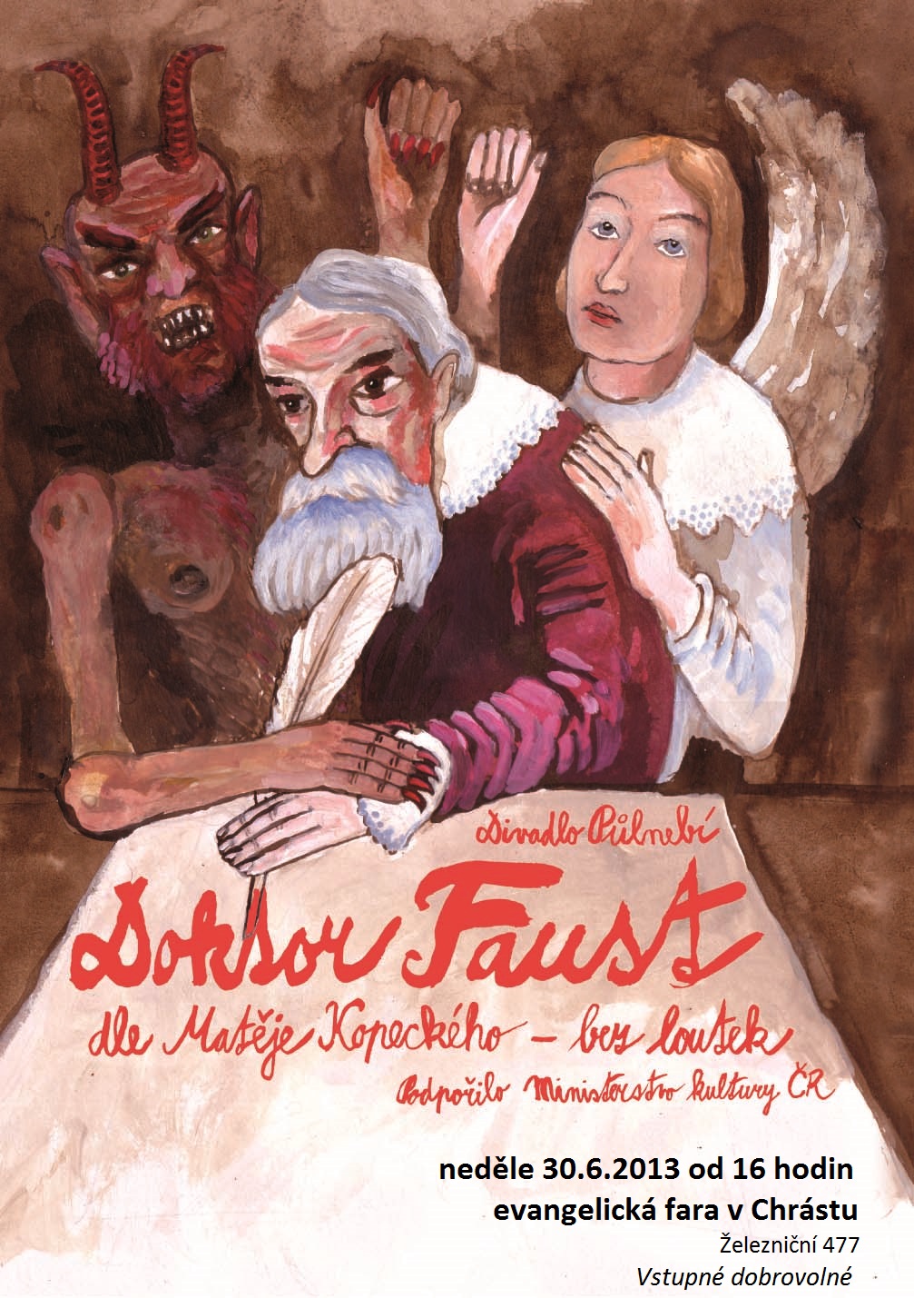 Na evangelické faře v Chrástu u Plzně proběhne poslední červnovou neděli inscenace hry Doktor Faust. Tu na základě předlohy Matěje Kopeckého podle sepsání jeho syna Václava upravilo a nastudovalo Divadlo Půlnebí.