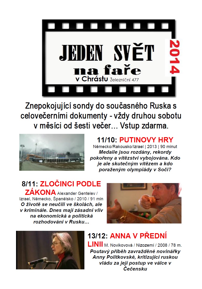 Během zimy opět promítáme - vždy druhou sobotu v měsíci od 18 hodin - celovečerní dokumenty. Vzhledem k aktuálnímu dění na východ od nás zařazujeme snímky, které otevírají znepokojivé pohledy na situaci v ruské společnosti. Vstup je volný. Po projekci je prostor pro diskusi k danému tématu.