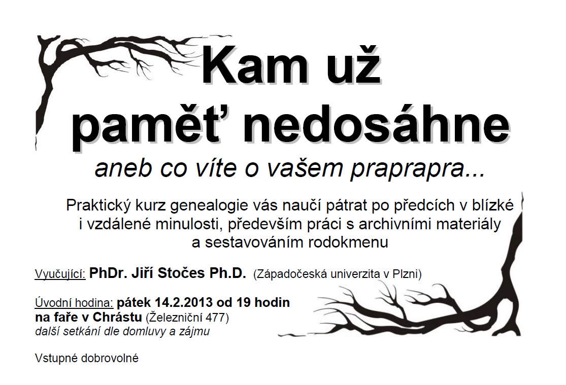 Pod tímto názvem se v pátek 14. února od 19 hodin uskuteční na faře v Chrástu úvodní setkání praktického kurzu genealogie. Účastníci se naučí pátrat po předcích v blízké i vzdálené minulosti, především pracovat s archivními materiály a sestavovat rodokmen.