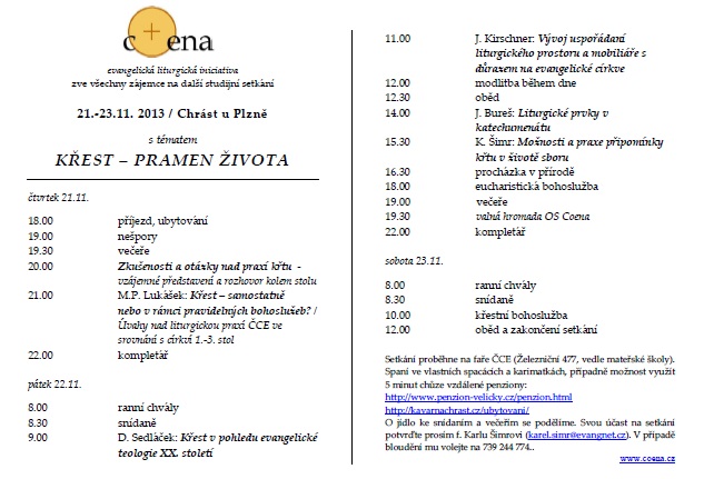 Od 21.11. do 23.11. 2013 proběhne na faře v Chrástu studijní setkání evangelické liturgické iniciativy Coena s názvem "Křest - pramen života". Přednášky i bohoslužby jsou otevřené všem zájemcům.