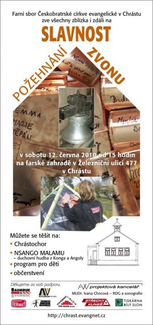9.5. 2010: Slavnost požehnání zvonu chystáme na sobotu 12. června od 15 hodin na farské zahradě. Těšit se můžete například na vystoupení souboru Nsango malamu, interpretujícího duchovní hudbu z Konga a Angoly.