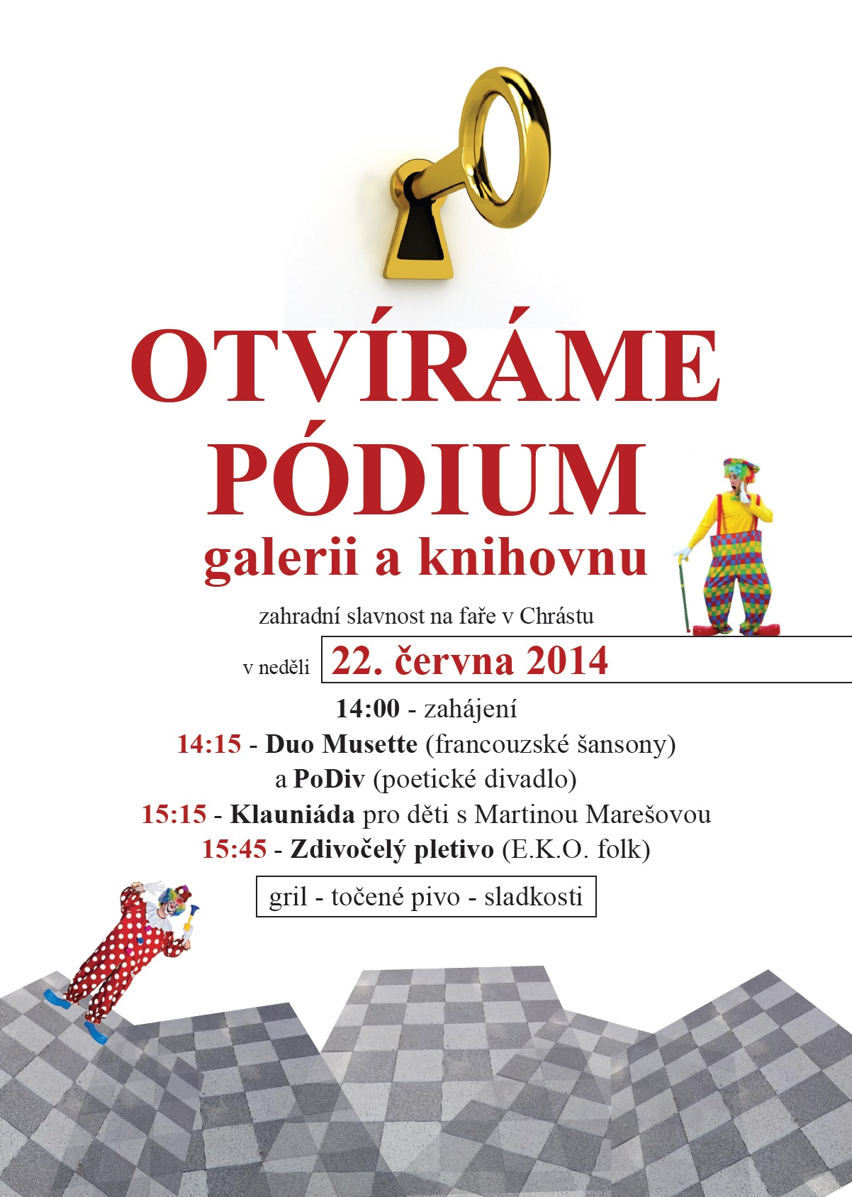 V neděli 22. června 2014 od 14 hodin zveme k zahradní slavnosti na závěr školního roku s otevřením a požehnáním pódia na farské zahradě a knihovny a galerie na faře.