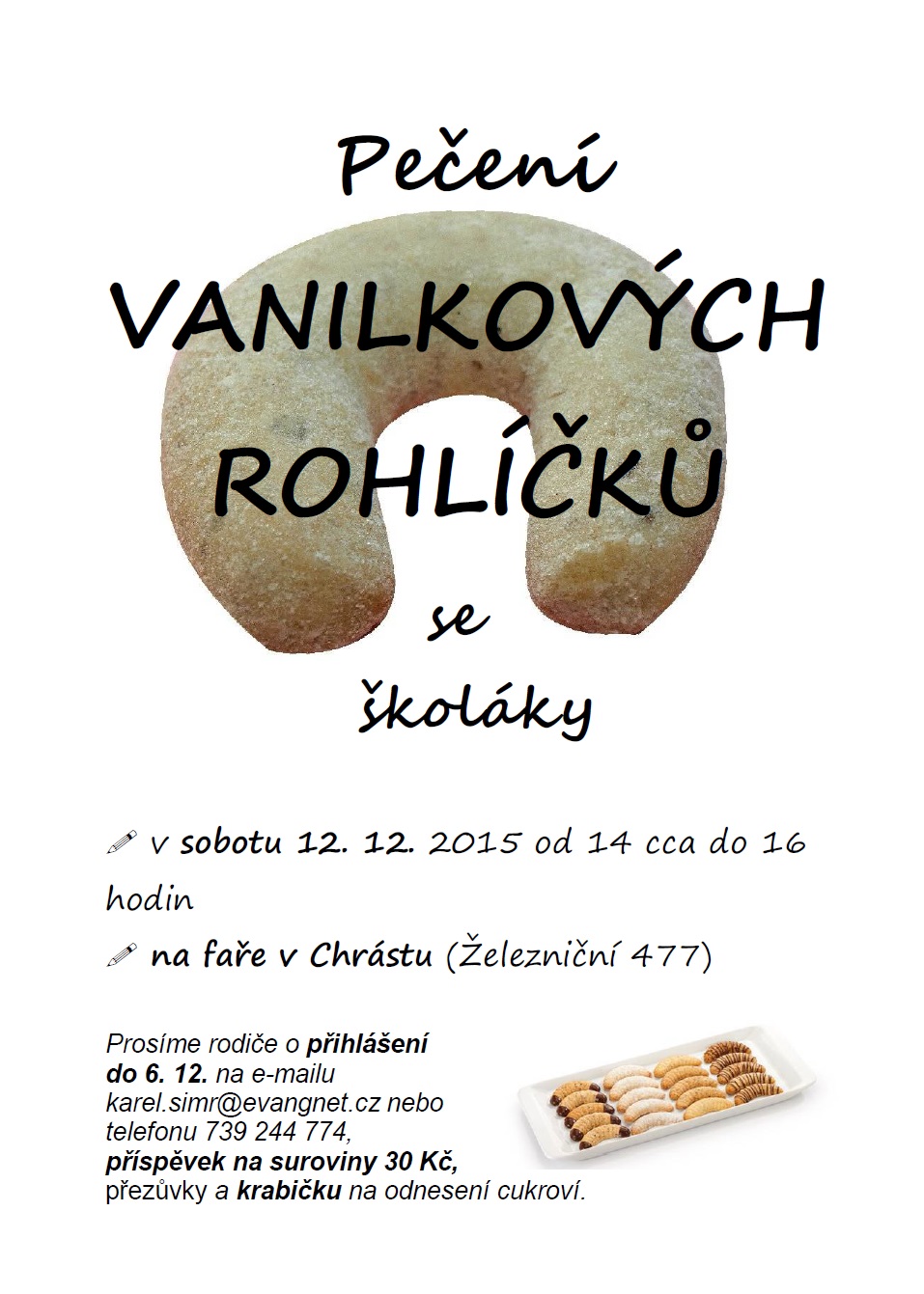 V sobotu 12. prosince 2015 od 14 cca do 16 hodin budeme na faře se školáky péct vanilkové rohlíčky, které si odnesou domů.