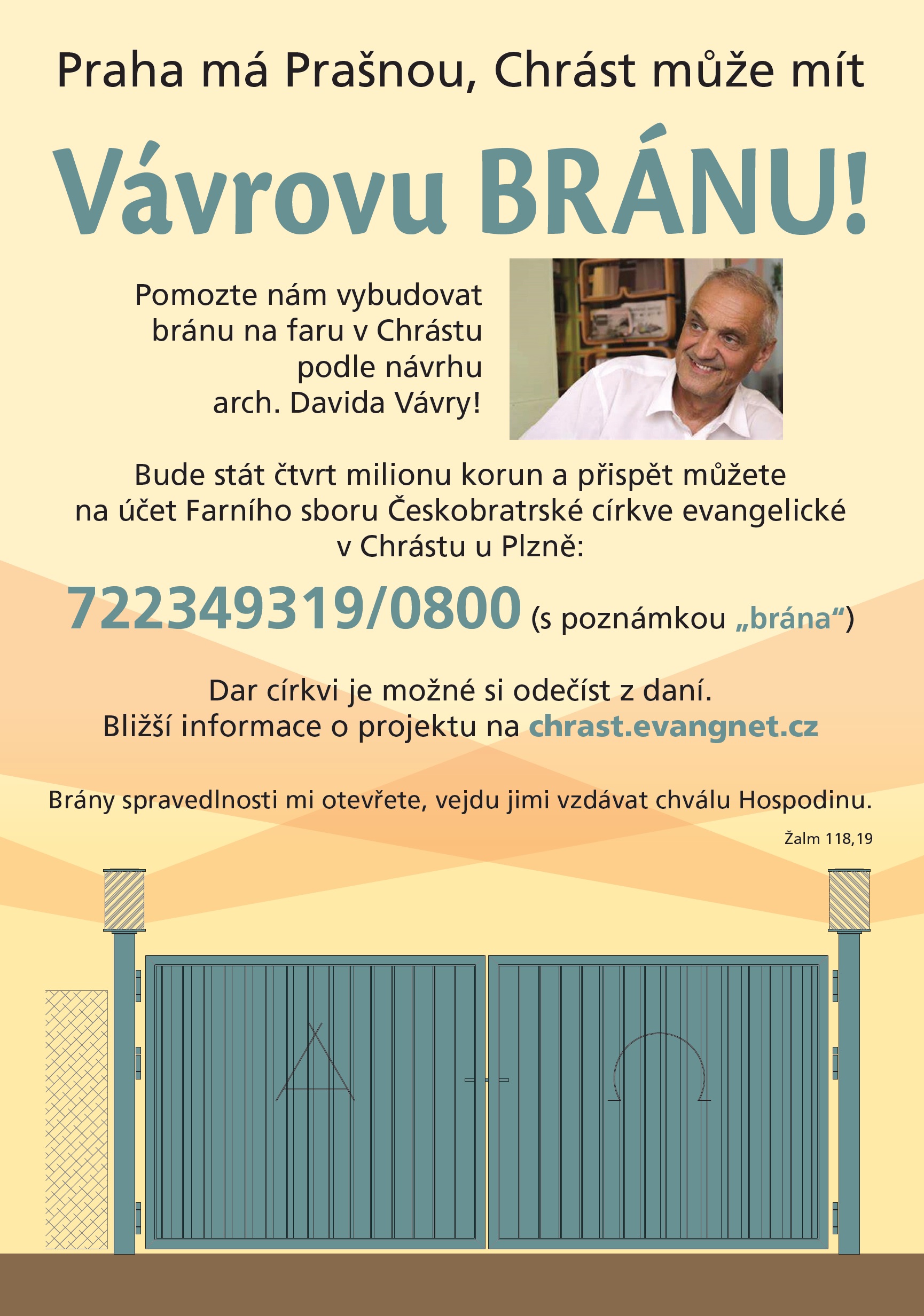 Brána bude stát čtvrt milionu korun. V jejím financování jsme odkázání pouze na štědrost dárců ve sboru i mimo něj. Pokud vás projekt zaujal, můžete se na jeho uskutečnění podílet jakoukoli částkou. Přispět můžete na účet sboru 722349319/0800 se zprávou pro příjemce „brána“.